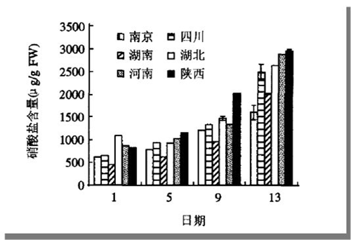 图说:南京林业大学森林资源与环境学院在2006年4月1日、5日、9日、13日分别在全国6个地点采集了香椿芽,检测其中的硝酸盐含量,发现在香椿芽较幼嫩的时期,不同种源香椿的硝酸盐含量都低于规定的限量标准,可安全食用。而随着嫩芽长大,硝酸盐和亚硝酸盐的含量也逐步上升。