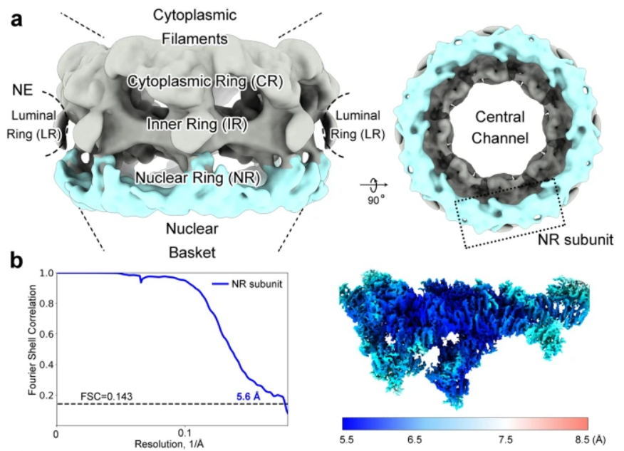 核孔复合体 (NPC) 是细胞质和细胞核之间货物运输的唯一常规途径。NPC 位于所有真核细胞的核膜 (NE) 上。尽管 NPC 的大小和组成可能因物种而异,但整个组织在所有真核生物中都是保守的。脊椎动物 NPC 的总分子量超过 100 MDa,由三个中央环支架组成,共同定义中央孔:细胞质环 (CR)、内环 (IR) 和核环 (NR) 。CR 和 NR 具有相似的整体结构,并以一组保守的核孔蛋白为特征。NPC 中心的 IR 被两个外环(CR 和 NR)夹在中间,呈现出双重对称性。