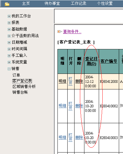 点击“修改字段”,完成。查看效果:在Excel中,用admin登陆“示例数据库”,点击“销售”-“销售日报”:登记日期是按降序排序: