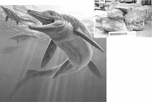 早期鱼龙的臆想图(大图)及其遗骸化石(小图)。图片来源:National Geographic Magazine