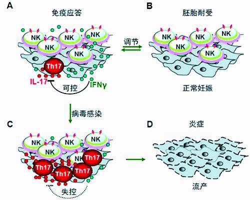 在妊娠过程中,母—胎界面存在大量与众不同的自然杀伤细胞,天然杀伤能力很低,但可以产生伽马干扰素,抑制由于胚胎基因不合而产生的炎症细胞,使母体对胎儿并不产生排斥反应。如果母体同时遭遇病毒等病原体感染,会产生大量炎症细胞,导致自然杀伤细胞失去抑制能力,甚至显出杀伤力,最终导致胚胎丢失或流产。该研究1月15日发表在美国《国家科学院院刊》。
