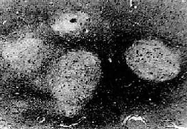 图16-16 流行性乙型脑炎 脑组织内有多发性镂空软化灶 4)胶质细胞增生小胶质细胞增生明显,形成小胶质细胞结节(图16-14),后者多位于小血管或坏死的神经细胞附近。少突胶质细胞的增生也很明显。星形胶质细胞增生和胶质瘢痕形成,在亚急性或慢性病例中较为多见。 临床病理联系 本病病变分布广泛,神经细胞广泛受累,患者常出现嗜睡、昏迷以及颅神经核受损所致的颅神经麻痹症状。由于脑内血管扩张充血,血流淤滞、血管内皮细胞受损,致血管通透性增高而引起脑水肿和颅内压升高,病人常出现头痛、呕吐。严重的颅内压增高可引起脑疝,其中小脑扁桃体疝可致延髓呼吸中枢受压而致死。由于脑膜有不同程度的反应性炎症,临床上有脑膜刺激症状和脑脊液中细胞数增多的现象。 本病患者经过治疗,大多数在急性期后可痊愈,脑部病变逐渐消失。病变较重者,可出现痴呆、语言障碍、肢体瘫痪及颅神经麻痹引起的吞咽困难、中枢神经性面瘫、眼球运动障碍等,这此表现经数月之后多能恢复正常。少数病例病变不能完全恢复而留下后遗症。 (四)狂犬病 狂犬病(rabies)是狂犬病毒引起的传染病。狂犬病的流行于犬、猫等(狼、蝙蝠等亦可感染),成为狂犬病毒的贮存宿主。人被病犬(或病猫等)咬伤,唾液中的病毒经伤口侵入人体,沿周围神经(主要是感觉神经)至背根节经脊髓入脑而致病。 狂犬病的潜伏期随伤口的部位而异,如面部咬伤者潜伏期较下肢被咬伤者要短得多。本病临床表现为创口疼痛、头痛、发热、不安、怕风,饮水时反射性咽喉痉挛,故有恐水病之称。后期可出现昏迷、呼吸衰竭。 病理变化 脑和脊髓充血明显,病变一般在神经根节、脑干下端、下丘脑等部位最为显著。镜下,可见弥漫性急性脑脊髓炎变化,有不同程度的神经元损害,从变性到坏死及神经细胞被吞噬;血管周围有淋巴细胞、浆细胞浸润,形成血管套。神经细胞内出现特征性的Negri小体具有病理诊断意义。该小体是神经细胞浆内的包含体,呈圆形或椭圆形,边界清楚,体积大,呈嗜酸性着色,多见于海马锥体细胞、小脑Purkinje细胞和大脑锥体细胞。每一神经细胞胞浆中小体的数目从一个到数个不等(图16-17)。炎症病变严重的部位,Negri小体数目往往不多。
