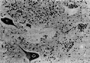 图16-15 脊髓灰质炎 脊髓前角内运动神经细胞变性坏死及消失,胶质细胞增生,并有粒细胞浸润 3.肉眼观脊髓充血明显,脊髓前角充血,病变严重者可显示出血和坏死。晚期,前角萎缩,前根(运动神经根)萎缩、变细。瘫痪的肌肉明显萎缩,肌纤维小,其间为脂肪组织和结缔组织所填充。 临床病理联系 由于病变部位和严重程度的不同,临床表现各异。神经元损害须达到一定程度才会出现瘫痪症状,本病以脊髓腰膨大的病变最为严重,瘫痪常发生在下肢;其次为颈膨大,引起上肢瘫痪。脑干的运动神经核受累,可引起颅神经麻痹,如面神经麻痹(Ⅶ,对),软腭瘫痪(Ⅸ,对),声音嘶哑(Ⅹ,对),吞咽困难(Ⅻ,对)等。延髓网状结构受累可引起呼吸、血管运动中枢障碍,导致中枢性呼吸衰竭和循环衰竭而致死。 一般病例发病后1~2周即进入临床恢复期,瘫痪肢体开始有不同程度的恢复。未能完全恢复者,患者肌肉逐渐萎缩,成为后遗症。 (三)虫媒病毒感染 目前已知的虫媒病毒有数百种之多,均为RNA病毒,其中能引起较严重疾病者有十余种。在我国常见的是由蚊传播的乙型脑炎和蜱传播的森林脑炎。 流行性乙型脑炎(epidemic encephalitis B)是乙型脑炎病毒感染所致的急性传染病,多在夏季流行,儿童发病率明显高于成人,尤以10岁以下儿童为多,约占乙型脑炎的50%~70%。乙型脑炎之称在于与冬季发生的昏睡性甲型脑炎相区别,后者自1925年后已无流行,仅有散发病例出现。 病因及传染途径 乙型脑炎病毒为RNA病毒,其传播媒介为蚊(在我国主要为三节吻库蚊)和长期贮存宿主。在自然界,其循环规律为:动物-蚊-动物,在牛、马、猪等家畜中隐性感染率甚高,一般仅出现病毒血症,成为人类疾病的传染源和贮存宿主。带病毒的蚊叮人吸血时,病毒可侵入人体,先在局部血管内皮细胞及全身单核吞噬细胞系统中繁殖,然后入血引起短暂性病毒血症。病毒能否进入中枢神经系统,取决于机体免疫反应和血脑屏障碍功能状态。凡免疫能力强,血脑屏障碍功能正常者,病毒不能进入脑组织致病,故成为隐性感染,多见于成人。在免疫功能低下,血脑屏障功能不健全者,病毒可侵入中枢神经系统而致病,由于受染细胞表面有膜抗原存在,从而激发体液免疫与细胞免疫,导致损伤和病变的发生。 病变 本病病变广泛累及整个中枢神经系统灰质,但以大脑皮质及基底核、视丘最为严重,小脑皮质、延髓及脑桥次之,脊髓病变最轻,常仅限于颈段脊髓。 肉眼观,脑膜充血,脑水肿明显,脑回宽,脑沟狭;切面上在皮质:深层、基底核、视丘等部位可见粟粒大小的软化灶,其境界清楚,弥漫分布或聚集成群。 镜下,可出现以下病变: 1)血管变化和炎症反应血管高度扩张充血,可发生明显的淤滞,血管周围间隙增宽,脑组织水肿,有时可见环状出血。灶性炎性细胞浸润多以变性和坏死的神经元为中心,或围绕血管周围间隙形成血管套(图16-13)。浸润的炎性细胞以淋巴细胞、单核细胞和浆细胞为主,仅在早期有为数不多的中性粒细胞。 2)神经细胞变性、坏死病毒在神经细胞内增殖,导致细胞的损伤,表现为细胞肿胀,Nissl小体消失,胞浆内空泡形成,核偏位等。病变严重者神经细胞可发生核浓缩、溶解、消失,为增生的少突胶质细胞所环绕,出现卫星现象。此外,噬神经细胞现象也很常见。 3)软化灶形成灶性神经组织的坏死、液化,形成镂空筛网状软化灶,对本病的诊断具有一定的特征性。病灶呈圆形或卵圆形,边界清楚(图16-16),分布广泛,除大脑(顶叶、额叶、海马回)皮质灰、白质交界处外,丘脑、中脑等处也颇常见。关于软化灶发生的机制至今尚未能肯定,除病毒或免疫反应对神经组织可能造成的损害外,病灶的局灶性分布提示,局部循环障碍(淤滞或小血管中透明血栓形成)可能也是造成软化灶的一个因素。