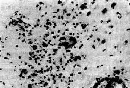 图16-18 AIDS亚急性脑炎 示病灶内形成的不典型多核巨细胞 中枢神经系统的常见机会感染为:巨细胞病毒、带状疱疹病毒、单纯疱疹病毒脑炎,进行性多灶性白质脑病,隐球菌和弓形虫感染等。 (六)慢病毒感染 大多数慢病毒感染疾病均发生在中枢神经系统,其临床特点为潜伏期长(数月至数十年不等),起病缓慢,呈进行性、致死性发展。这类疾病有十余种,发生在人类者有4种。 1.亚急性硬化性全脑炎本病是中枢神经系统持续性麻疹病毒感染所致,患者多为儿童和青少年(4~20岁),有麻疹病史,临床表现为精神和运动障碍、肌阵挛、抽搐,最后出现痴呆和去皮质强直。 病理变化:肉眼观,脑质地较坚硬,部分区域呈颗粒状。镜下,神经细胞被吞噬,血管周围单核细胞浸润;星形胶质细胞增生,神经元和少突胶质细胞核内包含体形成;电镜下可见包含体内有类似麻疹病毒的颗粒。 脑组织中持续存在病毒颗粒可能与宿主T细胞抑制有关,也可能由于病毒本身M蛋白的缺乏,致病毒的装配、释放发生障碍,使感染持续存在。M蛋白缺乏的原因至今尚不明了。同于麻疹疫苗的广泛使用,因缺陷麻疹病毒引起的本病已极为少见。 2.进行性多灶性白质脑病本病是一种乳多泡病毒所致之机会性中枢神经系统感染,见于晚期造血系统恶性肿瘤,应用免疫抑制剂、免疫缺陷病(AIDS)和慢性消耗性疾病(结核病、结节病、类风湿性关节炎)等患者。临床上,本病往往出现在上述各类疾病后数月或数年,患者多为中年人,但也可见于儿童。 本病病变的特点是脑白质中不对称分布的多发性不规则形灰色透明凹陷病灶,质地软,严重者病灶可融合,甚至呈囊性变。镜下可见大小不一的脱髓鞘病灶,其中有多少不一的泡沫细胞。特异性变化包括:①少突胶质细胞的异常是本病有诊断意义的变化,表现为核大而深染,其中有紫色或嗜伊红色包含体。电镜下可见核内有多量乳多泡病毒样颗粒,②星形胶质细胞大而奇异,多核浓染。与本病有关之乳多泡病毒为JC、BK和SV40病毒。由于约65%正常人血清中可检出其特异性抗体,本病的发生究竟是陈旧感染复燃,还是易感宿主被感染尚未阐明。 3.海绵状脑病本病为一组疾病,其共同特点是脑灰质疏松呈海绵状,其中亚急性海绵状脑病和Kuru病可见于人类和灵长类。此类疾病的病原体为小分子量(60000)的糖蛋白称为Prion(Pr)。Pr是正常神经元的膜蛋白,本身并不致病。如其结构发生一个氨基酸的变异,形成Pr5C则不能被蛋白酶完全降解,形成Pr27-30。后者形成类淀粉蓄积于神经元胞体内,造成神经元死亡。Pr27-30感染(接种)于另一个体可起模板作用,进行大量复制,造成疾病蔓延。Kuru病仅发生在大洋洲巴布亚新几内亚,由于食人尸脑而传播。革除陋习后此病几乎已绝迹。 亚急性海绵状脑病 又名Creutsfield-Jacob disease(CJD)病,是少见的世界性散发疾病,表现为进行性痴呆。预后差,无有效治疗。在人类中其传播途径尚不清楚,经角膜移植所致之医源性感染的病例已有报道。本病最突出的病理变化是大脑各叶(以额叶、颞叶为甚)均有极明显的神经细胞脱失,伴星形细胞高度增生,而无炎症反应。脑皮质疏松呈海绵状,白质大多正常。有时纹状体、丘脑、小脑表层等处亦可发生类似变化。电镜下可见海棉空隙乃神经元和胶质细胞突起中的空泡形成。 (责任编辑:泉水) |