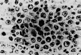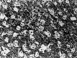 临床病理联系 多数患者起病缓慢,早期多无症状。主要表现为无痛性淋巴结肿大。晚期病变可累及多处淋巴结或其他器官。根据受累的器官不同可引起不同的症状。NHL的扩散途径与HD不同,多无一定规律。晚期病人常有发热、盗汗、消瘦及肝、脾肿大。 儿童淋巴瘤与成人淋巴瘤有些不同,淋巴结外器官的淋巴瘤比较多见。曲折核T细胞淋巴瘤伴纵隔肿块者和Burkitt淋巴瘤常见于儿童,前者常伴有急性淋巴细胞性白血病,预后很差。NHL的预后与病变范围和肿瘤的组织类型有关。病变局限在一个部位者预后较好。多组淋巴结受累、肝脾肿大或侵犯其他器官者预后较差。肿瘤的组织类型中,一般以小淋巴细胞型、浆细胞样淋巴细胞型和有核裂的滤泡中心细胞型,尤其是早期瘤细胞呈滤泡样增生者比弥漫增生者预后较好。无核裂细胞型预后较差。免疫母细胞型和曲折核T细胞淋巴瘤预后最差。 特殊类型的淋巴瘤 1.Burkitt淋巴瘤 Burkitt淋巴瘤是1958年Burkitt首先描述的发生于非洲儿童的一种淋巴瘤。现在世界各地都发现类似的病例。我国也有少数病例报道。患者主要为儿童和青年人。男性多于女性。 病变特点为肿瘤常发生于颌骨、颅面骨、腹腔器官和中枢神经系统等。一般不累及外周淋巴结和脾,也很少发生白血病。颌骨和眼眶的肿瘤在局部生长,侵蚀破坏附近组织,造成面部畸形。肿瘤发生于腹腔,常形成巨大肿块,并可累及腹膜后淋巴结、卵巢、肾、肝、肠等。累及中枢神经系统的肿瘤可侵犯脑膜或压迫脊髓。 肿瘤由小无核裂滤泡中心细胞恶性增生而来。镜下见大量瘤细胞弥漫增生,细胞大小相似,形态单一,胞浆少,呈嗜碱性及明显的嗜派若宁性。胞浆内有一些脂肪小空泡。细胞核较大,圆或椭圆形,染色质细,常有2~3个明显的核仁,核分裂像多见。肿瘤细胞常变性、坏死。瘤细胞表面有单克隆性免疫球蛋白,多数为IgM伴κ轻链,证实瘤细胞来自B细胞。瘤细胞间散在多数吞噬各种细胸碎屑的巨噬细胞,形成所谓满天星图像(图11-4)。 图11-4 Burkitt淋巴瘤 瘤细胞由小无核裂滤泡中心细胞组成,细胞大小相似,核圆形。瘤细胞间散在多数吞噬细胞呈“满天星”图像 ×280 Burkitt淋巴瘤对化疗效果较好,缓解期长。本病原因尚不清楚,由于常发生在温暖潮湿地带,故有人认为可能与蚊子或其他昆虫传播的病毒性感染有关。非洲流行区EB病毒感染率很高。约95%非洲Burkitt淋巴瘤细胞有EB病毒基因组,并且Burkitt淋巴瘤患者抗EB病毒抗体滴度增高。因此有人认为EB病毒与Burkitt淋巴瘤的发生有关。 此外,还有一组淋巴瘤也来源于小无核裂细胞,并具有与Burkitt淋巴瘤相似的细胞标记,但瘤组织结构和病人的预后与Burkitt淋巴瘤不同,称为非Burkitt淋巴瘤。非Burkitt淋巴瘤的瘤细胞比较多形性,大小不一,细胞核大小也不一致。核仁大而明显,有时只有一个大核仁。巨噬细胞造成的“满天星”现象不多见(图11-5)。非Burkitt淋巴瘤比较少见。多发生于成年人,治疗效果较差,预后也较差。 图11-5 小无核裂滤泡中心细胞型淋巴瘤—非Burkitt淋巴瘤 瘤细胞大不不甚一致,胞浆少,核多为圆形,大小形状也不一致 ×770 2.蕈样霉菌病 蕈样霉菌病(mycosis fungoides)是原发于皮肤的T细胞淋巴瘤。多发生于40~60岁。男性多于女性,约为2:1。 肉眼观,皮肤病变早期表现为湿疹样病损,皮肤瘙痒,表面有不规则的红色或棕色斑疹,逐渐发展使皮肤增厚变硬呈斑块状。以后形成多数不规则的棕红色瘤样结节。有时可溃破。 镜下可见皮肤表皮和真皮浅层及血管周围有多数瘤细胞和嗜酸性粒细胞、淋巴细胞、浆细胞和组织细胞浸润。瘤细胞体积较大,核大,染色深,高度扭曲,有深切迹,呈折叠状或脑回状。这些瘤细胞SIg阴性,与羊红细胞形成E花环,CD4+,来自T辅助细胞。真皮内的瘤细胞常侵入表皮,在表皮内聚集成堆形似小脓肿称为Pautrier微脓肿。晚期表皮可溃破,并可向深部浸润及真皮深部。 蕈样霉菌病早期病变局限于皮肤,以后常扩散至淋巴结和内脏,多见于脾、肝、肺和骨髓等处。病变局限于皮肤者治疗效果较好,扩散至内脏者预后较差。 (责任编辑:泉水) |