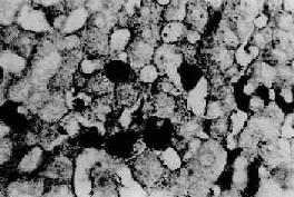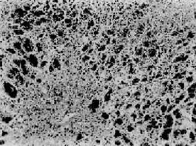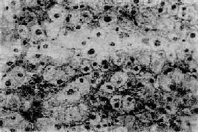 图10-37 慢性活动性肝炎 肝细胞明显气球样变和嗜酸性变,小叶界板破坏呈现碎片状坏死,门管区见炎性细胞浸润 毛玻璃样肝细胞 多见于HBsAg携带者及慢性肝炎患者的肝组织。光镜下,HE染色切片上,此等肝细胞浆内充满嗜酸性细颗粒状物质,不透明似毛玻璃样故称毛玻璃样肝细胞(图10-38)。这些细胞内含大量HBsAg,电镜下呈线状或小管状积存在内质网池内。用免疫酶标法或免疫荧光法可呈HBsAg阳性反应。(图10-39)。