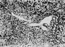 图10-40 急性重型肝炎 肝细胞大片坏死消失,小叶中心部最重,周边部残存的肝细胞变性。坏死区有炎性细胞浸润