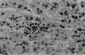 图10-35 急性病毒性肝炎 游离于肝窦内的嗜酸性小体(↑处),窦内皮细胞肿胀增生 ×800 (3)点状坏死(spotty necrosis):肝小叶内散在的灶状肝细胞坏死。每个坏死灶仅累及1至几个肝细胞。同时该处伴以炎性细胞浸润(图10-36)。