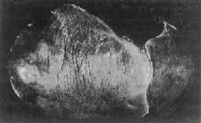 图10-39 肝细胞内的乙型肝炎表面抗原 免疫酶标法(双PAP)染色显示肝细胞浆内的HBsAg 3.重量病毒性肝炎本型病情严重。根据起病急缓及病变程度,可分为急性重型和亚急性重型二种。 (1)急性重型肝炎:少见。起病急,病变发展迅猛、剧烈,病死率高。临床上又称为暴发型、电击型或恶性型肝炎。 本型病变可见肝细胞坏死严重而广泛。肝索解离,肝细胞溶解,出现弥漫性的大片坏死。坏死多自小叶中央开始,向四周扩延,仅小叶周边部残留少数变性的肝细胞。肝窦明显扩张充血并出血,Kupffer细胞增生肥大,并吞噬细胞碎屑及色素。小叶内及汇管区有淋巴细胞和巨噬细胞为主的炎性细胞浸润(图10-40)。残留的肝细胞再生现象不明显。肉眼观,肝体积显著缩小,尤以左叶为甚,重量减至600~800g,质地柔软,表面被膜皱缩(图10-41)。切面呈黄色或红褐色,有的区域呈红黄相间的斑纹状,故又称急性黄色肝萎缩或急性红色肝萎缩。