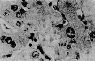 图10-42 酒精性肝炎 图中央区肝细胞浆内见成群的酒精透明小体 ×400 3.酒精性肝硬变(alcoholic cirrhosis) 一般认为此种肝硬变是由脂肪肝和酒精性肝炎进展而来。一般的脂肪肝,如继续酗酒则多发展为酒精性炎,再演变为肝硬变。酒精性肝炎时肝细胞发生坏死,最终引起纤维化。相邻肝小叶的纤维化条索相互连接,导致肝小叶的正常结构被分割破坏,发展成假小叶及肝细胞结节状再生,形成酒精性肝硬变。 发病机制 肝是酒精代谢、降解的主要场所。酒精对肝有直接损伤作用。其机制如下: 1.NADH对NAD比值增高的效应进入肝内的酒精,在乙醇脱氢酶和微粒体乙醇氧化酶系的作用下转变为乙醛,再转变为乙酸。后一反应使辅酶Ⅰ(NAD)转变为还原型辅酶Ⅰ(NADH),因而NADH/NAD值增高。①NADH增多有抑制线粒体三羧酸循环的作用,从而使肝细胞对脂肪酸的氧化能力降低,可引起脂肪在肝内堆积而发生脂肪肝。②NADH增多可使细胞代谢中的乳酸增多,后者对肝内脂肪变及胶原形成等有促进作用。③NADH增多,使线粒体增加以NADH的再氧化,致耗氧过多。肝细胞因缺氧而易于发生坏死和纤维化。 2.乙醛的毒性作用在酒精代谢过程中产生的乙醛具有强烈的生化反应和毒性,可影响肝细胞膜的性状及抑制肝细胞合成的蛋白的分泌排出。 3.营养缺乏作用嗜酒者常有的营养不足,尤其是蛋白质缺乏,使肝内氨基酸及酶类减少,可以促进酒精的毒性作用。 五、肝硬变 肝硬变(liver cirrhosis)是一种常见的慢性肝病,可由多种原因引起。肝细胞弥漫性变性坏死,继而出现纤维组织增生和肝细胞结节状再生,这三种改变反复交错进行,结果肝小叶结构和血液循环途径逐渐被改建,使肝变形、变硬而形成肝硬变。本病早期可无明显症状,后期则出现一系列不同程度的门静脉高压和肝功能障碍。 肝硬变按病因分类为:病毒肝炎性、酒精性、胆汁性、隐源性肝硬变。按形态分类为:小结节型、大结节型、大小结节混合型及不全分隔型肝硬变(为肝内小叶结构尚未完全改建的早期硬变)。我国常用的分类是结合病因及病变的综合分类,分为:门脉性、坏死后性、胆汁性、淤血性、寄生虫性和色素性肝硬变等。以上除坏死后性相当于大结节及大小结节混合型外,其余均相当于小结节型。其中门脉性肝硬变最常见,其次为坏死后性肝硬变。其它类型较少。 (一)门脉性肝硬变 门脉性肝硬变(portal cirrhosis),旧称雷奈克(Laennec)肝硬变,相当于小结节型肝硬变。为各型肝硬变中最常见者。本病在欧美因长期酗酒者引起多见(酒精性肝硬变),在我国及日本,病毒性肝炎则可能是其主要原因(肝炎后肝硬变)。 病因和发病机制 1.病毒性肝炎慢性病毒性肝炎,尤以乙型慢性活动性肝炎是肝硬变的主要原因,其中大部分发展为门脉性肝硬变。在肝硬变患者肝内常显HBsAg阳性。其阳性率高达76.7%。另外,近年明确的丙型肝炎,大部可转为慢性,由慢性活动性肝炎转为肝硬变者达35%。 2.慢性酒精中毒在欧美国家因长期酗酒引起的肝硬变可占总数的40%~50%。 3.营养缺乏此项因素作为肝硬变的原因尚有争议。动物实验表明,饲喂缺乏胆碱或蛋氨酸食物的动物,可经过脂肪肝发展为肝硬变。 4.毒物中毒某些化学毒物对肝有破坏作用,长期作用可引起肝硬变。临床上偶有因含砷的杀虫剂、辛可芬、四氯化碳、黄磷等慢性中毒引起肝硬变的报告。 上述各种因素首先引起肝细胞脂肪变、坏死及炎症等,以后在坏死区发生胶原纤维增生。后者主要来自增生的纤维母细胞、局部的贮脂细胞及因肝细胞坏死,局部的网状纤维支架塌陷,网状纤维融合形成胶原纤维(无细胞硬化)。初期增生的纤维组织虽形成小的条索但尚未互相连接形成间隔而改建肝小叶结构时,称为肝纤维化。为可复性病变,如果病因消除,纤维化尚可被逐渐吸收。如果继续进展,小叶中央区和汇管区等处的纤维间隔互相连接,终于使肝小叶结构和血液循环被改建而形成肝硬变(图10-43)。