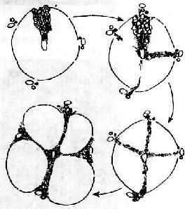 图10-43门脉性肝硬变假小叶形成过程示意图 病变 肉眼观,早、中期肝体积正常或略增大,质地正常或稍硬。后期肝体积缩小,重量减轻,由正常的1500g减至1000g以下。肝硬度增加,表面呈颗粒状或小结节状,大小相仿,最大结节直径不超过1.0cm(图10-44)。切面见小结节周围为纤维组织条索包绕。结节呈黄褐色(脂肪变)或黄绿色(淤胆)弥漫分布于全肝。