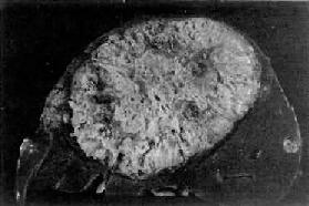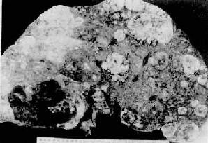 十、原发性肝癌 原发性肝癌(primary carcinoma of liver)是由肝细胞或肝内胆管上皮细胞发生的恶性肿瘤,简称肝癌。其发生率在各国和地区差异很大,在亚非国家较常见,我国发病率较高,属于常见肿瘤之一。发病年龄多在中年以上,男多于女。近年来,我国对肝癌的防治研究取得了显著的成绩。一些直径在1cm以下的早期肝癌(小肝癌)已被发现并取得满意的疗效。对诊断肝癌有辅助价值的甲胎蛋白(AFP)测定已广泛应用,肝癌时其阳性率占70%以上。 病变 肉眼类型 早期肝癌或小肝癌是指瘤体直径在3cm以下,不超过2个瘤结节的原发性肝癌。瘤结节呈球形或分叶状,灰白色质较软,切面无出血坏死,与周围组织界限清楚(图10-51)。晚期肝癌,肝体积明显增大可达2000g以上。癌组织可局限于肝的一叶(多为右叶),也可弥散于全肝并大多合并肝硬变。有时硬变的再生结节与癌结节肉眼不易区别。肉眼可分三型。 图10-51 小肝癌伴肝硬变 图为切除的部分肝组织,右侧见一圆形、直径约3cm的单一癌结节 1.巨块型肿瘤为一实体巨块,有的可达儿头大,圆形,多位于肝右叶内甚至占据整个右叶(图10-52)。瘤块质地较软,中心部常有出血坏死。瘤体周边常有散在的卫星状瘤结节。不合并或合并轻度的肝硬变。 图10-52 原发性肝癌(巨块型) 中央为巨大的灰白色癌块,外围可见散在的小型癌结节 2.多结节型最多见,常发生于较重肝硬变的肝内。瘤结节多个散在,圆形或椭圆形,大小不等,直径由数毫米至数厘米,有的相互融合形成较大的结节(图10-53)。被膜下的瘤结节向表面隆起致肝表面凹凸不平。 图10-53 原发性肝癌(结节型) 肝切面见多数圆形、椭圆形、大小不等的癌结节 3.弥漫型癌组织在肝内弥漫分布,无明显的结节或形成极小结节。常发生在肝硬变基础上,少见。 组织学类型:过去认为组织学类型对预后评估意义不大,近年研究表明,有些特殊类型,如透明细胞型、层状纤维化型(fibrolamellar type)及微小或包裹型(minute or encapsulated type)肝癌预后均较好。按组织发生可将肝癌分为三大类。 1.肝细胞癌最多见,是由肝细胞发生的肝癌。其分化较好者癌细胞类似肝细胞。分化差者癌细胞异型性明显,常有巨核及多核瘤细胞。有的癌细胞排列成条索状(索状型)(图10-54);亦可呈腺管样(假腺管型)或实体团块状(实体型)。有时癌细胞为深染的小细胞(小细胞型)。有时癌组织中有大量纤维组织分割(硬化型),分割的纤维组织多且呈分层状(层状纤维化型)。 图10-54 原发性肝细胞癌 左下:肝细胞区 右上:坏死崩解的癌细胞 中间区:索状型肝细胞癌,癌细胞有明显的异型性 ×100 2.胆管上皮癌较为少见,是由肝内胆管上皮发生的癌。其组织结构多为腺癌或单纯癌。较少合并肝硬变。有时继发于华支睾吸虫病。 3.混合性肝癌具有肝细胞癌及胆管上皮癌两种结构,最少见。 肝母细胞瘤(hepatoblastoma) 是婴、幼儿原发的肝恶性肿瘤,患者常合并大肠息肉病。AFP反应常呈阳性。肉眼观为界限清楚的孤立性肿块,多位于肝右叶。大小5~25cm不等。瘤组织常有囊性变、坏死及出血。镜下,瘤组织包含有分化程度不同的上皮及间叶成分。上皮性瘤细胞有小梭形、深染少胞浆的胚胎型细胞及较大有胞浆的胎儿型细胞。此细胞有时胞浆含糖原呈透明或颗粒状。间叶成分中可见有骨样、软骨样组织及分化为肌组织。 蔓延和转移 肝癌首先在肝内蔓延和转移。癌细胞常沿门静脉播散,在肝内形成转移癌结节,还可逆行蔓延至肝外门静脉主干,形成较大的癌栓,有时可阻塞管腔引起门静脉高压。肝外转移常通过淋巴道转移至肝门淋巴结、上腹部淋巴结和腹膜后淋巴结。晚期可通过肝静脉转移到肺、肾上腺、脑及骨等处。有时肝癌细胞可直接种植到腹膜和卵巢表面,形成种植性转移。 临床病理联系 临床上多有肝硬变病史,进行性消瘦,肝区疼痛、肝迅速增大,黄疸及腹水等表现。有时由于肝表面癌结节自发性破裂或侵破大血管而引起腹腔内大出血。由于肿瘤压迫肝内外胆管及肝组织广泛破坏而出现黄疸。 病因 以下因素与肝癌发生有关。 1.病毒性肝炎现知乙型肝炎与肝癌有密切关系,其次为近年确定的丙型肝炎。肝癌病例HBsAg阳性率可高达81.82%。国外报告,在肝癌高发地区有60%~90%的肝癌来自HBV。近年报道,在HBV阳性的肝癌患者可见HBV基因整合到肝癌细胞DNA中。因之认为HBV是肝癌发生的重要因素。最近,HCV的感染也被认为可能是肝癌发生的病原因素之一。据报道,在日本有70%,在西欧有65%~75%的肝癌患者发现HCV抗体阳性。 2.肝硬变 肝硬变与肝癌之间有密切关系。据统计,一般需经7年左右肝硬变可发展为肝癌。其中以坏死后性肝硬变为最多,肝炎后肝硬变次之,门脉性肝硬变最少。 3.真菌及其毒素黄曲霉菌、青霉菌、杂色曲霉菌等都可引起实验性肝癌。其中以黄曲霉菌(aspergillus flavus)最为重要。用该菌或其毒素(aflatoxin),或被其污染的食物均可诱发动物肝癌。在肝癌高发区,食物被黄曲霉菌污染的情况往往也较严重。 4.亚硝胺类化合物从肝癌高发区南非居民的食物中已分离出二甲基亚硝胺。此类化合物也可引起其它处肿瘤如食管癌。 十一、胆道癌 (一)肝外胆管癌 肝外胆管癌通常为腺癌,少数为鳞化腺癌及鳞癌等。长期慢性炎症、结石及囊性扩张等与癌发生可能有关。临床常表现为右上腹疼痛、包块、黄疸等。 胆管癌可发生于胆管的任何部位,在左