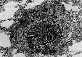 图9-22 矽肺 矽结节,由呈旋涡状排列的已发生玻璃样变的胶原纤维构成