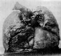 图9-23 矽肺 肺组织呈弥漫性纤维化 矽尘沿血道转运,可在肝、脾、骨髓等处形成矽结节。 矽肺的分期和病变特征 根据肺内矽结节的数量、分布范围和直径大小,可将矽肺分为三期: Ⅰ期矽肺:矽结节主要局限在淋巴系统。肺组织中矽结节数量较少,直径一般在1~3mm,主要分布在两肺中、下叶近肺门处。X线检查,肺野内可见一定数量的类圆形或不规则形小阴影,其分布范围不少于两个肺区。此时,肺的重量、体积和硬度无明显改变。胸膜上可有矽结节形成,但胸膜增厚不明显。 Ⅱ期矽肺:矽结节数量增多、体积增大,可散于全肺,但仍以肺门周围中、下肺叶较密集,总的病变范围不超过全肺的1/3。X线表现为肺野内有较多量直径不超过1cm的小阴影,分布范围不少于四个肺区。此时,肺的重量、体积和硬度均有增加,胸膜也增厚。 Ⅲ期矽肺(重症矽肺):矽结节密集融合成块。X线表现有大阴影出现,其长径不小于2cm,宽径不小于1cm,此时,肺的重量和硬度明显增加。解剖取出新鲜肺标本可竖立不倒(图9-24),切开时阻力甚大,并有砂粒感。浮沉试验,全肺入水下沉。团块状结节的中央可有矽肺空洞形成。结节之间的肺组织常有明显的灶周肺气肿,有时肺表面还可见到肺大泡。 图9-24 Ⅲ期矽肺并发肺心病 两肺坚实能竖立,胸膜增厚。右心显著肥大、扩大,心尖由右心构成 合并症 1.矽肺结核病 矽肺合并结核病时称为矽肺结核病(silicotuberculosis)。愈是晚期、重症矽肺,肺结核的合并率愈高。Ⅲ期矽肺的合并率达60%~70%或更高。矽肺患者易合并肺结核可能是因游离二氧化硅对巨噬细胞的毒性损害以及肺间质弥漫性纤维化,导致肺的血液循环和淋巴循环障碍,从而降低了肺组织对结核杆菌的防御能力之故。矽肺结核病时,矽肺病变和结核病变可分开存在,也可混合存在(9-25)。矽肺结核病的病变比单纯矽肺和单纯肺结核的病变发展更快,累及范围更广,更易形成空洞。矽肺结核性空洞的特点是数目多,直径大,空洞壁极不规则。较大的血管易被侵蚀,可导致患者大咯血死亡。