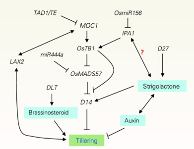 第一,在水稻发育生物学方面获得重大突破。水稻株型主要由每株分蘖数、分蘖角度和株高等因素决定。MOC1、LAX2、TAD1、OsMADS57、D27、IPA1/WFP、LAZY1、LPA1、PROG1和BC12/GDD1等基因的分离和鉴定为解析水稻株型形成的分子机制奠定了重要基础(图1);SLL1/RL9、OsCslD4、 LIC1、DLT、XIAO、OsGSR1、ILA1、LC2和NAL1等基因是叶型(包括叶片大小、形状和茎叶夹角)调控的重要基因,它们决定植株的光合效率和种植密度;OsRAA1、OsORC3、OsPHR2、LTN1、OsPHF1和OsMYB2B-1等基因参与根发育和养分利用的调控;开花时间(抽穗期)调节的关键基因RID1、Ghd7、DTH2、Ehd4、DTH8、EL1、ETR2、LC2、EG1、CFO1、OsMADS15、OsMADS1、DEP1、EP2和Gn1a等也得到详细阐述;而Ghd7、SP1和OsARG基因参与穗发育的调控。