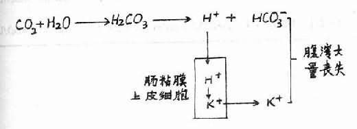 以上是K+代谢与酸碱平衡障碍之间的基本关系。但也应注意疾病发生发展过程中的变化是错综复杂的。因此在特殊情况下,也有特殊的变化出现。例如严重腹泻的病人,由于腹泻失钾而发生低血钾,同时又丧失HCO3-。这就使低血钾所能引起的碱中毒不能出现,而是一种代谢性酸中毒伴以低血钾。
