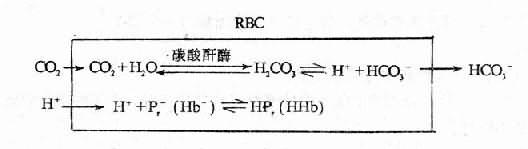 它的缺点是用得过多过快,病人呼吸抑制能导致缺氧及CO2重新积累。因为它能同时迅速降低H+和Pco2之故。此外,此药输注时不可漏出血管外,因为剌激性强能引起组织坏死。这些均应在使用中加以注意。 3.处理酸中毒时的高钾血症和病人失钾时的低钾血症:酸中毒常伴有高钾血症,在给碱纠正酸中毒时,H+从细胞内移至细胞外不断被缓冲,K+则从细胞外重新移向细胞内从而使血钾回降。但需注意,有的代谢性酸中毒病人因有失钾情况存在,虽有酸中毒但伴随着低血钾。纠正其酸中毒时血清钾浓度更会进一步下降引起严重甚至致命的低血钾。这种情况见于糖尿病人渗透性利尿而失钾,腹泻病人失钾等。纠正其酸中毒时需要依据血清钾下降程度适当补钾。 严重肾功能衰竭引起的酸中毒,则需进行腹膜透析或血液透析方能纠正其水、电解质、酸碱平衡以及代谢尾产物潴留等紊乱。 二、呼吸性酸中毒 呼吸性中毒(Respiratory Acidosis)的特征是血浆[H2CO3]原发性增高。 (一)原因和机制 1.呼吸中枢抑制一些中枢神经系统的病变如延脑肿瘤、延脑型脊髓灰质炎、脑炎、脑膜炎、椎动脉栓塞或血栓形成、颅内压升高、颅脑外伤等时,呼吸中枢活动可受抑制,使通气减少而CO2蓄积。此外,一些药物如麻醉剂、镇静剂、镇静剂(吗啡、巴比妥钠等)均有抑制呼吸的作用,剂量过大亦可引起通气不足。碳酸酐酶抑制剂如乙酰唑胺能引起代谢性酸中毒前已述及。它也能抑制红细胞中的碳酸酐酶而使CO2在肺内从红细胞中释放减少,从而引起动脉血Pco2升高。有酸中毒倾向的伤病员应慎用此药。 2.呼吸神经、肌肉功能障碍 见于脊髓灰质炎、急性感染性多发性神经炎(Guillain-barre综合征)肉毒中毒,重症肌无力,低钾血症或家族性周期性麻痹,高位脊髓损伤等。严重者呼吸肌可麻痹。 3.胸廓异常胸廓异常影响呼吸运动常见的有脊柱后、侧凸,连枷胸(Flail Chest),关系强直性脊柱炎(Ankylosing Spondylitis),心肺性肥胖综合征(Picwick综合征)等。 4.气道阻塞常见的有异物阻塞、喉头水肿和呕吐物的吸入等。 5.广泛性肺疾病是呼吸性酸中毒的最常见的原因。它包括慢性阻塞性肺疾病、支气管哮喘、严重间质性肺疾病等。这些病变均能严重妨碍肺泡通气。 6.CO2吸入过多指吸入气中CO2浓度过高,如坑道、坦克等空间狭小通风不良之环境中。此时肺泡通气量并不减少。 (二)机体的代偿调节 由于呼吸性酸中毒是由呼吸障碍引起,故呼吸代偿难以发挥。H2CO3增加可由非碳酸氢盐缓冲系统进行缓冲,并生成HCO3-。但这种缓冲是有限度的。 1.细胞内外离子交换和细胞内缓冲这是急性呼吸性酸中毒的主要代偿调节。 细胞内外离子交换是指细胞外液[H+]升高时,H+进入细胞内,换出同符号的K+等。这样可以缓解细胞外液[H+]的升高。这与代谢性酸中毒时的离子交换一样。 所胃细胞内缓冲,是指进入细胞内的H+为细胞内缓冲物质如蛋白质(Pr-)等所缓冲,以及CO2弥散进入红细胞内的反应。此时由于CO2的蓄积而使Pco2急速升高,CO2通过红细胞膜进入红细胞内的正常过程加强。CO2与H2O在红细胞碳酸酐酶的催化下生成H2CO3,H2CO3解离为H+与H2CO3-。H+由血红蛋白缓冲,HCO3-转移至血浆中,使血浆HCO3-呈代偿性增加,如能使NaHCO3/H2CO3保持在正常范围内,则为代偿性呼吸性酸中毒。由于急性呼吸性酸中毒常发展迅速,肾脏代偿缓慢,故常为失代偿性的。 以CO2弥散入红细胞的量增加为例,其反应如下: