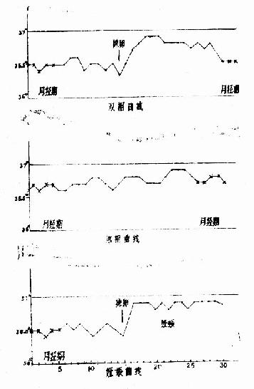 图148 用修削后压舌板作宫颈刮片 (三)活体组织检查 1.宫颈活检 暴露宫颈,拭净宫颈表面分泌物,局部消毒后,用活检钳在肉眼可疑癌变区,尽可能在鳞柱状上皮交界处取材,一般宜作多点活检,即在3、6、9、12点处取材。为了提高诊断阳性率,可在碘试验不着色区域或阴道镜检异常区多点活检。疑有宫颈管癌时,应同时作颈管搔刮术,刮出物固定后送病检,是确诊宫颈癌前病变或浸润癌的重要诊断方法。 2.诊断性刮宫及分段刮宫 以1:1000新洁尔灭液消毒外阴,碘酒和酒精消毒阴道与宫颈,用子宫探针测定宫腔的深度,然后用小刮匙沿宫腔四壁、宫底及两侧角有秩序地刮除全部内膜,刮出物均送病检。为鉴别子宫内膜癌及宫颈癌或子宫内膜癌累及子宫颈管,必须行分段诊刮,先刮宫颈管,再刮宫腔,刮出物分别装瓶标明送病检。 (四)卵巢功能检查 1.基础体温(图149) 早晨醒后用口表测体温,记录并绘成基础体温曲线图,以了解卵巢功能,有无排卵、排卵日期及卵巢黄体功能。一般连续测量三个月以上。正常情况下,月经前半周期(即卵泡期),基础体温较低,约36.5℃,在排卵期更低,排卵后在孕激素的影响下,体温升高至36.5℃~37℃左右,直至月经来潮时又下降,这种体温曲线的变化称“双相型体温”,表示有排卵,正常黄体期不少于12天,体温上升幅度不低于0.3~0.5℃。如月经周期后半期体温不上升者称“单相型体温”,表示无排卵。如果体温上升后持续3周以上不下降并有闭经,可能为妊娠。 2.宫颈粘液检查 宫颈粘液是颈管内膜分泌细胞分泌的,受卵巢分泌的雌孕激素影响,所以可用宫颈粘液的量、透明度、粘稠性、结晶及上皮细胞的变化,判断卵巢功能,目前临床常用宫颈粘液结晶形态,对诊断不孕症、早孕、闭经及功能性子宫出血等方面有一定应用价值。用镊子或血管钳伸入宫颈管内0.5cm处取粘液,置于玻片上,待干燥后,显微镜下检查,观察其出现的各种结晶形态: