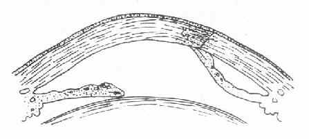 4.角膜新生血管在角膜炎症或溃疡的病变过程中,充血的角膜缘周围毛细血管网伸出新生的血管支侵入角膜时,称角膜新生血管。上皮下新生血管,来自浅层血管网,呈树枝状,色鲜红,与结膜血管相连。前基质新生血管起源于深层血管网;后基质的新生血管来自虹膜动脉大环和放射状虹膜血管伸到角膜缘的分支。深层新生血管呈毛刷状,色暗红。伴有角膜上新生血管的出现是机体修复功能的表现。 在炎症期,角膜新生血管很容易看到,炎症消退后,存留在相对透明角膜上的新生血管,仅存管腔没有血液,名叫影子血管(ghost vessels),较难发现。角膜新生血管,一方面可使角膜失去透明性,另一方面使角膜组织发生生物化学的变化,由不参与整体组织的免疫赦免状态,到参与免疫反应,因而可能导致角膜移植时的排斥反应。 四、角膜炎症与后遗症 (一)虹膜睫状体炎和角膜瘢痕浅、深层角膜溃疡或角膜基质炎。在炎症阶段,可并发虹膜炎或虹膜睫状体炎。此时若形成前房积脓,则为无菌性前房积脓。当角膜溃疡或基质炎愈合、修复后,在角膜上形成的不透明部分叫角膜瘢痕。其对视力的影响,随瘢痕的厚薄、大小及位置而异。 1.角膜云翳(corneal nebual)薄云雾状的角膜瘢痕。用斜照法或裂隙灯检查方法可发现。 2.角膜斑翳(corneal macula)较厚,呈灰白色混浊,半透明,肉眼即可看见。 3.角膜白斑(cornel leucoma )为最厚的角膜瘢痕,呈乳白色或瓷白色混浊,不透明,一望而知。 (二)角膜溃疡穿孔引起的并发症与后遗症 1.角膜瘘(corneal fistula)小的角膜穿孔后,如果角膜上皮细胞沿创缘长入创口内,防碍穿破口愈合,则形成角膜瘘,使眼球内外相通,很容易引起球内感染。检查时,在角膜混浊处中央可看到一个黑色小点。前房变浅,眼压降低。用荧光素滴在角膜上,从瘘孔流出的房水会将荧光素冲淡,形成一条淡绿色细流。如瘘管暂时被上皮细胞封闭,在该处可见一小泡,眼压恢复或升高时又破溃。如此反复,威胁眼球。 2.前极性白内障(anterior polar cataract)在角膜穿孔后,前房突然消失,角膜破口直接与晶体接触及毒素的刺激,可引起晶体局部代谢障碍,发生晶体前极局限性混浊,为前极性白内障。 3.虹膜脱出(iris prolapse)角膜溃疡穿孔时,由于房水流出,虹膜可脱出于穿孔处,瞳孔失去圆形,呈瓜子状,其尖端朝向虹膜脱出处,(图6-3)此时眼压降低,眼球变软。在愈合过程中,可出现以下几种情况。