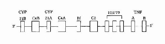 图5-2 人类HLA复合体结构示意图 1.HLA-Ⅰ类基因 在Ⅰ基因区内存在多达31个有关的Ⅰ类基因座,其中HLA-A、HLA-B和HLA-C为经典的HLA-Ⅰ类基因,其它基因的产物分布有限,且其功能不明,另外还有许多伪基因. 2.HLA-Ⅱ类基因 HLA-Ⅱ类基因区包括近30个基因座,其中经典的Ⅱ类基因一般指DR、DP和DQ,它们编码的产物均为双肽链(α、β)分子。近年来,陆续发现了一些位于Ⅱ类基因区的新基因座,其中某些基因的产物与内源性抗原的处理与呈递有关。 3.HLA-Ⅲ类基因 HLA-Ⅲ类基因区域至少已发现36个基因座,其中C2、C4、Bf座编码相应的补体成分,另外还有21羧化酶基因(CYP21A、B)肿瘤坏死因子基因(TNFA、B)以及热休克蛋白70(heat shock protein70,HSP70)基因。补体C4由二个不同的基因(C4A与C4B)编码。HLA-Ⅲ类基因区结构见图5-3。