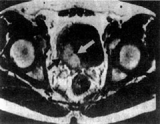 图4-4-10 膀胱癌 (二)前列腺肥大与前列腺癌 前列腺的大小同年龄有关,但一般其直径不超过5cm。前列腺肥大可,见前列腺向膀胱底突入。边缘光滑,密度均匀,一般是两侧对称,便可一侧肥大明显。冠状面显示更为清楚。 前列腺癌在包膜内生长时,CT难于确诊,只有当侵破包膜向周围脂肪组织中浸润时才可能诊断。表现为前列腺轮廓不整,密度不均。直肠前壁及膀胱壁可被浸润,精囊角消失。CT还可发现淋巴结转移和盆骨转移。CT对前列腺癌的分期有帮助。 MRI上,因前腺增生主要发生于中央区,故T2WI上显示中区央增大。而前列腺癌多发生于周围区,致使周围区在T2WI上信号有局限低或稍低信号的结节影。因此MRI比CT更具诊断价值。但前列腺癌的MRI表现不典型时,诊断仍较困难。 (责任编辑:泉水) |