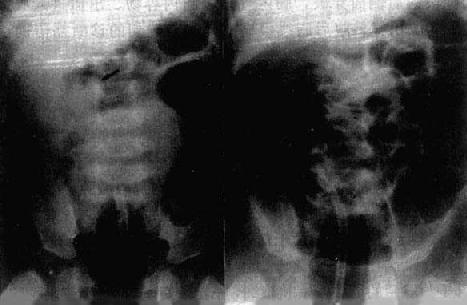 图4-1-4 小肠梗阻(立位) 不同病因所致单纯性机械性肠梗阻还有一定的X线表现特点。例如,蛔虫团堵塞所致肠梗阻,小肠内的大量蛔虫,常扭曲成团、束。胆石性肠梗阻除有肠梗阻征象外,可发现腹内较大阳性结石,由于有胆肠内瘘,还可见肝内胆管积气征象。 2.绞窄性小肠梗阻 常见病因有:扭转、内疝、套叠和粘连等。由于有小肠系膜受累,肠曲活动被牵制。伸展受限,因而有肠曲向某一固定部位聚集的表现。肠壁循环障碍而导致肠壁增厚,粘膜皱襞增粗,肠内积液、液面较高等改变。闭袢性肠梗阻,还可见“假肿瘤”征。绞窄性小肠梗阻后期,可合并腹腔积液,由于合并动力性因素,结肠和直肠可以充气。 不同病因所致绞窄性肠梗阻还具有一定的X线表现特点。例如,小肠系膜扭转、内疝及粘连性肠梗阻合并肠段扭转时,常合并“假肿瘤”征;粘连性肠梗阻在不同体位的X线照片上,如仰卧前后位和侧卧水平位,可见充气积液的小肠曲活动减低,部分病例可出现肠曲纠集征象和肠曲转角较急的表现;急性肠套叠以回肠(或同时合并盲肠)套入结肠这一类型最为常见。腹部平片主要表现为低位小肠梗阻,有时右腹或上腹部可见肠形肿块及套叠远端结肠和套鞘积气征。钡剂、空气灌肠可见包括套入部梗阻端所形成的杯口状或圆形充盈缺损和套鞘因钡剂或气体进入两层肠壁之间所形成的弹簧状影(图4-1-5)。
