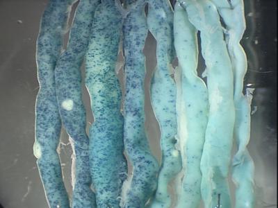 图片说明:12英寸长的小鼠小肠被来回折叠放置。科学家发现被Bmi1基因(附上了蓝色染料)标记的成体肠干细胞很明显大都位于上三分之一肠内(左边),几乎不存在于中下部肠道中。(图片来源:Eugenio Sangiorgi, University of Utah)