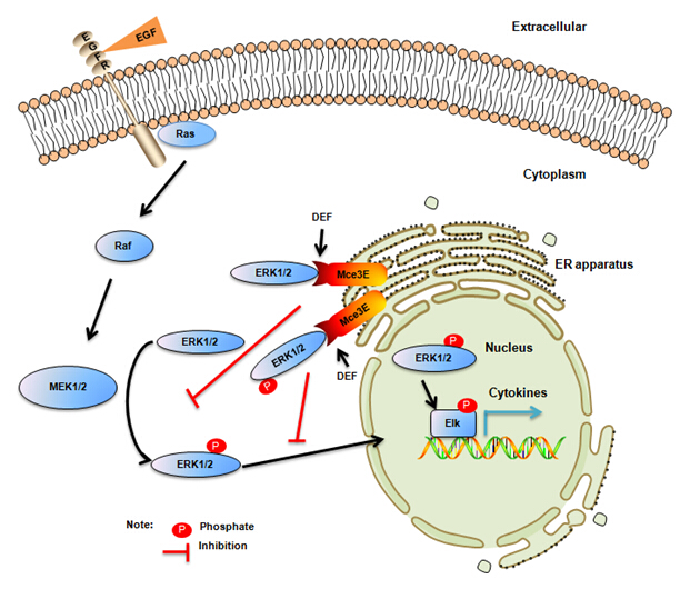 中国科学院微生物研究所刘翠华研究团队致力于研究结核分枝杆菌等重要病原菌与宿主相互作用的分子机制,继2015年3月初以封面故事在免疫学杂志Nature Immunology 上发表有关“结核分枝杆菌分泌的效应蛋白PtpA利用泛素分子抑制宿主固有免疫的新机制”这一重要研究结果后 (Nature Immunology, 2015, 16:237-245.),该团队针对结核分枝杆菌效应蛋白Mce3E调控宿主固有免疫方面的研究又获新进展,The Journal of Immunology 于近日在线发表了相关研究结果。该研究揭示了结核分枝杆菌的Mce3E蛋白以一种独特的“空间调控”模式在巨噬细胞中抑制固有免疫信号通路的新机制。 近年来,不断涌现和扩散的耐药结核病例给全球人口健康、经济发展和社会稳定带来了极大影响。由于目前可有效治疗耐药结核病的药物种类非常有限,迫切需要探寻新的抗结核药靶。结核病的病原菌结核分枝杆菌 (M. tuberculosis, Mtb) 作为一种典型的胞内菌可逃逸机体免疫系统的监视和清除而得以在宿主巨噬细胞中长期存活,但其确切的分子机制尚未完全明确。 很多病原菌可通过分泌效应蛋白干扰或调控宿主中某些关键蛋白分子的修饰(如泛素化和磷酸化等),进而有效地干扰宿主细胞的功能,并最终促进病原菌在宿主细胞中的存活。目前有关Mtb分泌的效应蛋白调控宿主细胞功能的研究仅涉及该领域的冰山一角,还有许多问题尚待解答。例如,Mtb分泌的效应蛋白可调控宿主细胞的何种功能?它们涉及哪些关键信号通路及宿主互作蛋白分子?它们与宿主蛋白分子互作的生化机制如何?针对这一系列问题的深入研究无疑将有助于更好地理解结核病的发病机制并为其防治奠定理论基础。 Mtb基因组中共有四个mce(mammalian cell entry)操纵子(mce1-4),其编码的蛋白组成一大类Mce家族。由于Mce家族蛋白可特异性地结合小分子化合物,并且它们在人基因组中无同源基因,因而是一种理想的潜在药靶。以往研究提示mce3操纵子可能在结核分枝杆菌的致病过程中起重要作用,但该操纵子编码的单个蛋白分子的确切功能尚不清楚。在研究员刘翠华的指导下,该课题组的硕士研究生李杰等综合应用分子微生物学、生物化学与分子生物学、细胞生物学和免疫学等方法和技术研究结核分枝杆菌Mce3E对宿主固有免疫的调控作用及机制。揭示了结核分枝杆菌mce3操纵子编码的Mce3E蛋白可通过抑制细胞外信号调节激酶Erk1/2的磷酸化及相关的固有免疫信号通路,进而促进分枝杆菌在巨噬细胞内的存活。在感染过程中,Mce3E可被分泌至巨噬细胞中。一方面,Mce3E可通过其DEF模序(一种特异性结合Erk1/2等MAPK分子的模序)与MEK1竞争性地结合Erk1/2分子,从而抑制MEK1对Erk1/2的的磷酸化作用;而另一方面,Mce3E还特异性地定位在宿主细胞的内质网,并通过结合磷酸化的Erk1/2分子(p-Erk1/2)而将其滞留在内质网而抑制其入核,从而加强对Erk1/2信号通路的抑制作用(请见附图)。这些新的研究成果有助于进一步阐明结核分枝杆菌潜伏感染及致病的分子机制,同时还为基于Mce3E-Erk1/2互作界面的抗结核药物设计提供了新靶点。 刘翠华课题组的硕士研究生李杰为该文章的第一作者,刘翠华为该文的通讯作者。该研究得到了国家科技部“973”计划、国家自然科学基金项目、国家“十二五”传染病重大专项和中科院重点部署项目的资助,在中国科学院微生物研究所完成。 (责任编辑:泉水) |