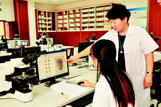 上色后逐个“翻看”细胞 标本,是一个个装有透明液体的小玻璃瓶。