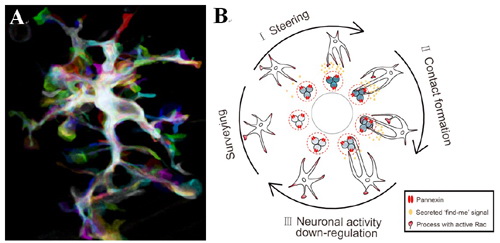 11月29日,Developmental Cell在线发表了中科院上海生科院神经所杜久林研究组题为《静息态小胶质细胞与神经元之间的双向功能调节》的研究论文。该工作由博士生李莹和杜旭飞在杜久林研究员的指导下共同完成。 小胶质细胞是中枢神经系统中重要的免疫效应细胞。在病理状态下,小胶质细胞会迅速的激活,变成阿米巴形态,迁移并参与到一系列免疫反应及组织修复过程中。在生理状态下,小胶质细胞处于“静息”状态,在保持胞体位置不变的同时伴随着许多细胞突起不断地伸缩以探寻周围的环境。长期以来,关于静息态小胶质细胞的作用以及它与环境中神经元发生紧密接触的功能意义所知甚少。 在该项研究中,作者以斑马鱼为模式动物,运用活体共聚焦和双光子成像、谷氨酸解笼锁技术、活体电生理记录、荧光能量共振转移成像等方法,发现了静息态小胶质细胞与神经元之间的双向功能调节。他们首先在斑马鱼幼鱼中同时对小胶质细胞形态以及神经元电活动进行长时程在体成像观察,发现神经元电活动升高可以吸引静息态小胶质细胞的突起朝向电活动高的神经元运动并且促进它们之间形成紧密接触。在这个过程中,神经元表达的Pannexin-1通道以及小胶质细胞中的Rac蛋白起到至关重要的作用。进一步研究发现,这种静息态小胶质细胞和神经元间的紧密接触可以反过来下调被接触神经元的自发性电活动以及视觉反应。 该工作首次证明了神经元电活动可以调控静息态小胶质细胞的运动,并揭示了小胶质细胞对神经元活动的稳态调节,为神经-免疫交叉领域提供了新的研究思路。 该研究工作受到科技部973计划和重大科学研究计划、中国科学院“百人计划”、上海市“浦江人才”计划和基础研究重大项目等基金资助。 (责任编辑:泉水) |