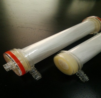 宁波材料所功能膜课题组,进行了系统的基础研究,从聚乳酸体系的成膜热力学及动力学机理,到微结构的控制,最终通过精确调控相转化工艺及原位聚合接枝肝素,得到了一系列壁厚为40~100μm,内径为200~450μm的聚乳酸基中空纤维膜,并制备成血液透析膜组件。其超滤系数PWP达到42ml/H·m2·mmHg,对小分子尿素的清除率达到175ml/min,对中分子物质溶菌酶的清除率达到33%,对大分子蛋白BSA的截留率达到95%以上。该生物基聚合物中空纤维透析膜的制备方法已经申请了国家发明专利(201210547368.0),有望用于新一代的血液透析器。 (责任编辑:泉水) |