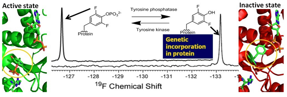 该研究通过基因密码子扩展的手段实现了氟代酪氨酸在原核酪氨酸激酶Etk活性中心Tyr574位点的高效特异插入,以此作为19F NMR的磷酸化探针并首次获得Etk活性中心的pTyr574与Arg614之间相互作用而导致Etk激活的直接证据。另外,研究人员将氟代酪氨酸插入到真核酪氨酸激酶c-Src活性中心的Tyr416磷酸化位点,利用19F NMR检测到dasatinib(针对BCR/Abl和c-Src的抗肿瘤药物)与c-Src激活状态活性中心的结合所引起的构象变化。这为研究酪氨酸激酶的激活机制以及基于酪氨酸激酶与底物相互作用进行抗肿瘤药物的筛选提供了重要的手段。