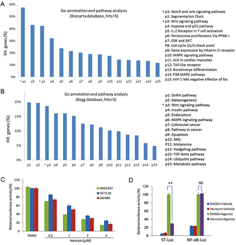 在中国科学院昆明植物研究所李艳研究员和孙汉董院士的指导下,应用化学生物学与全基因表达谱芯片技术,博士生李兴尧等首次发现对映-贝壳杉烷型二萜化合物鄂西香茶菜素henryin具有显著的Wnt信号通路抑制活性,并选择性抑制Wnt信号持续激活的结肠癌细胞增殖。机理研究表明,henryin通过直接抑制β-catenin/TCF4转录复合物的结合下调Wnt靶基因的表达,从而将细胞阻滞在G0/G1期。研究对一系列对映-贝壳杉烷型二萜化合物的构效关系进行了分析,明确了活性必需基团。研究结果为对映-贝壳杉烷型二萜化合物的抗肿瘤药物开发奠定了药理学基础,对于发现用于治疗wnt信号过度激活导致的肿瘤药物先导分子具有重要的意义。