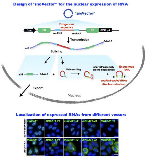 研究组以细胞核内定位的lncRNA,如 NEAT1、HOTAIR为研究对象,成功地提高了它们在细胞核的定位。重要地是,我们还证明以这种载体表达的两端以snoRNA结尾的NEAT1 可以模拟其内源RNA的功能,并发挥生物学作用。我们还证明该snoVector载体可以很有效地表达几乎任何长度在3kb以内的RNA,并使其滞留在细胞核内。例如该载体可以将原本定位于胞浆中mRNAs,如SNRPN、CEBPA等表达并滞留在细胞核内;一些通常被快速降解的内含子序列也能被稳定地表达并滞留在细胞核中;另外,该载体也可以用于表达miRNAs。此外,该载体能够产生绿色荧光蛋白,并含有抗性基因,可以用于稳定表达株的筛选。