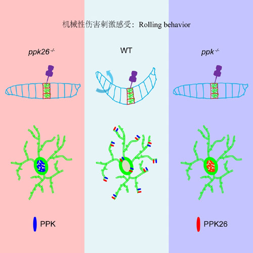 机械感受,包括听觉、触觉、平衡觉、机械性伤害刺激感受 (mechanical nociception) 等,对动物的生存至关重要。机械转导由机械门控的离子通道(mechano-gated ion channel)所介导。尽管机械门控离子通道的概念几十年前就已提出,但已知的机械门控离子通道仍然很少。机械性的伤害刺激由多模态的伤害性刺激感受器(polymodal nociceptor)所感受。在果蝇幼虫外周感觉系统中,第四类树突分支神经元(class IV dendritic arborization neuron)即为多模态的伤害性感受器。在分子水平上,以前的研究发现,PPK、Pain和Piezo离子通道在第四类树突分支神经元中参与伤害性机械刺激的感受。