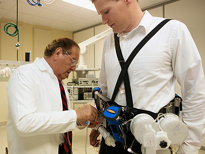 这个透析设备能够像正常肾脏那样缓慢持续地将体液从体内排出,而不像传统透析设备那样快速的工作。"慢速的工作能够降低患者的风险,提高舒适度"。它穿起来像一个工具带,通过导液管与人体相连。重达10磅,需要400ml水。血液通过这个"人工肾脏"24小时不停的透析,这种工作模式要好过通过传统透析设备一周仅做几次的透析。
