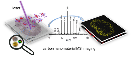 在国家自然科学基金委和中国科学院的大力支持下,中国科学院化学研究所活体分析化学院重点实验室的研究人员长期致力于动物组织质谱成像技术的研究,先后开发了系列小分子新基质(Anal. Chem. 2012, 84, 465; Anal. Chem. 2012, 84, 10291; Anal. Chem. 2013, 85, 6646;),并对半脑缺血(Anal. Chem. 2014, 86, 10114)、肿瘤转移等生物模型小鼠(Anal. Chem. 2015, 87, 422)的脑、肾、脾等组织进行了分子组织学质谱成像研究。最近,研究人员发展了一种通用、免标记的直接质谱成像方法,快速检测并对小鼠体内的碳纳米管、石墨烯和碳量子点等碳纳米材料进行定量成像研究。相关结果发表在近期的《自然·纳米技术》(Nature Nanotech. 2015, 10, 176)杂志上。