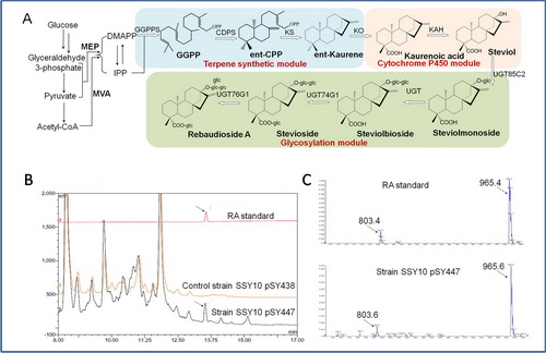 甜菊糖是仅存在于南美菊科植物甜菊(Stevia rebaudiana Bertoni)和中国的甜茶(Rubus suavissimus)等少数植物的一种四环二萜类化合物。近几十年来,随着人们对甜菊糖苷类化合物化学多样性和生理功能的认识,其作为下一代重要的健康天然甜味剂和潜在药物的价值已经获得了广泛的认可。王勇研究组基于前期构建的甜叶菊RNA序列数据库,对甜菊糖生物合成途径的关键酶进行了广泛地挖掘。通过在静息细胞中共表达候选的细胞色素P450基因和糖基转移酶基因,解析和鉴定了甜菊糖生物合成途径中的两个关键酶,并在大肠杆菌底盘细胞中重构了从头合成甜菊糖苷类化合物的非天然合成途径。经一系列理性设计的表达条件优化,使大肠杆菌中甜菊糖生物合成的关键中间体产量得到大幅度提高,并成功地获得了其主要组分RA。该研究为实现甜菊糖苷等重要二萜类化合物的合成生物制造奠定了基础,同时为改造大肠杆菌成为复杂萜类化合物异源合成的底盘细胞提供了成功范例。