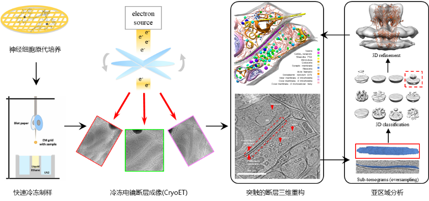 毕国强教授多年来着重于发展用于突触、神经网络及全脑尺度解析的前沿显微成像技术,自从2007年回国后,核心工作之一即是与周正洪教授和匹兹堡大学章佩君教授开展合作,发展CryoET原位三维成像技术,重点应用于突触结构与功能研究。毕国强教授与张小康、陶长路、刘云涛等学生一起,经过长达十年的艰苦攻关,研发了新型冷冻光电关联显微成像技术,在国际上开创性地开展了基于冷冻电镜与关联显微成像技术的神经突触超微结构与功能研究,首次利用CryoET解析了完整神经突触的三维结构,并实现了对中枢神经系统中两类最主要突触-兴奋性与抑制性突触的精确区分以及结构特征的定量化分析【1-4】。