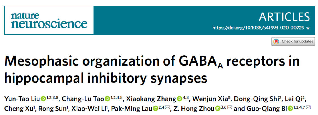 神经突触是大脑中众多神经元之间信息传递和存储的最基本的结构与功能单元。突触的异常则可能是导致如抑郁症和阿尔茨海默病等精神与神经疾病的起源。精确解析突触的蛋白分子结构和组织架构、及其在神经活动或异常过程中的变化是解密大脑奥妙的一个关键环节,也是脑科学与脑疾病研究中最基础的核心研究方向之一。由于缺乏有效的研究手段,神经突触在很大程度上仍旧是一个黑盒子。冷冻电镜(CryoEM)技术的快速发展,一方面使得众多通过分离纯化后的蛋白质等生物大分子近原子分辨三维结构得以解析,另一方面,基于最新的冷冻电镜断层三维成像技术(CryoET)能够对保存在近生理状态下细胞和组织样本进行纳米分辨率的三维成像,为在神经突触及其它细胞区室中原位解析蛋白质分子结构和组织架构带来了新的契机。 2020年11月2日,中国科学技术大学、中国科学院深圳先进技术研究院双聘教授毕国强和刘北明团队,与美国加州大学洛杉矶分校周正洪教授合作在Nature Neuroscience杂志上发表文章Mesophasic organization of GABAA receptors in hippocampal inhibitory synapses,通过发展前沿冷冻电镜断层三维成像技术,首次解析了抑制性突触中GABAA受体的原位三维结构,并阐释了GABAA受体和支架蛋白在抑制性突触中具有层级化的介态相分离的组织规则。