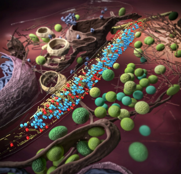 图2. 抑制性突触中受体等蛋白分子、细胞器等超微结构的三维可视化(图片版权:陶长路、刘云涛、毕国强;图片制作:王国燕、马燕兵) 受体分子与支架蛋白的这种半稳定性组织分布特征,否定了早期关于抑制性突触中受体蛋白规则锚定在支架蛋白所形成稳定的六边形网格上的推测;另一方面,GABAA受体在相分离边界内相对均匀分布的特性,也不同于基于超分辨光学成像所发现的兴奋性突触中受体蛋白具有局部纳米域分布的特性。抑制性突触中受体分子与支架蛋白的这种介态自组织形式,使得突触同时具备了稳定性和可变性,这一特性从分子组织结构层面很好地解释了学习与记忆的突触机理。 本研究中, GABAA受体原位三维结构的首次解析,为受体蛋白原位高分辨解析以及相应药物作用机理和治疗药物开发研究奠定了基础;对抑制性突触分子组织架构的解析表明利用冷冻电镜断层成像技术对突触这一黑匣子的解密迈出了关键的一步。 本论文共同第一作者为中国科学技术大学博士生刘云涛(现美国加州大学洛杉矶分校博士后)、博士后陶长路(现中科院深圳先进技术研究院副研究员)和中科院深圳先进技术研究院正高级工程师张小康,通讯作者为刘北明教授、周正洪教授和毕国强教授。江苏大学夏文君副教授完成了其中数学建模和计算模拟工作。毕国强教授领衔的团队依托中国科大合肥微尺度国家研究中心与中科院深圳先进院成立的脑信息研究中心现招聘博士后、研究助理和研究生(包括客座学生),详见文末。