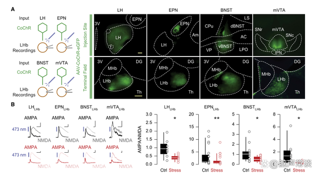 研究人员想进一步确定应激引起的突触抑制是具有环路特异性还是广泛发生于与LHb相关的脑区。在外侧下丘脑、基底神经节的内脚核、终纹的床核及内侧腹侧被盖区等向LHb传递谷氨酸能的脑区进行病毒注射,在应激后记录LHb中特异性的AMPA/NMDA电流的比值,结果显示,应激四个脑区对于LHb的AMPAR传递均会产生影响。 ![]()